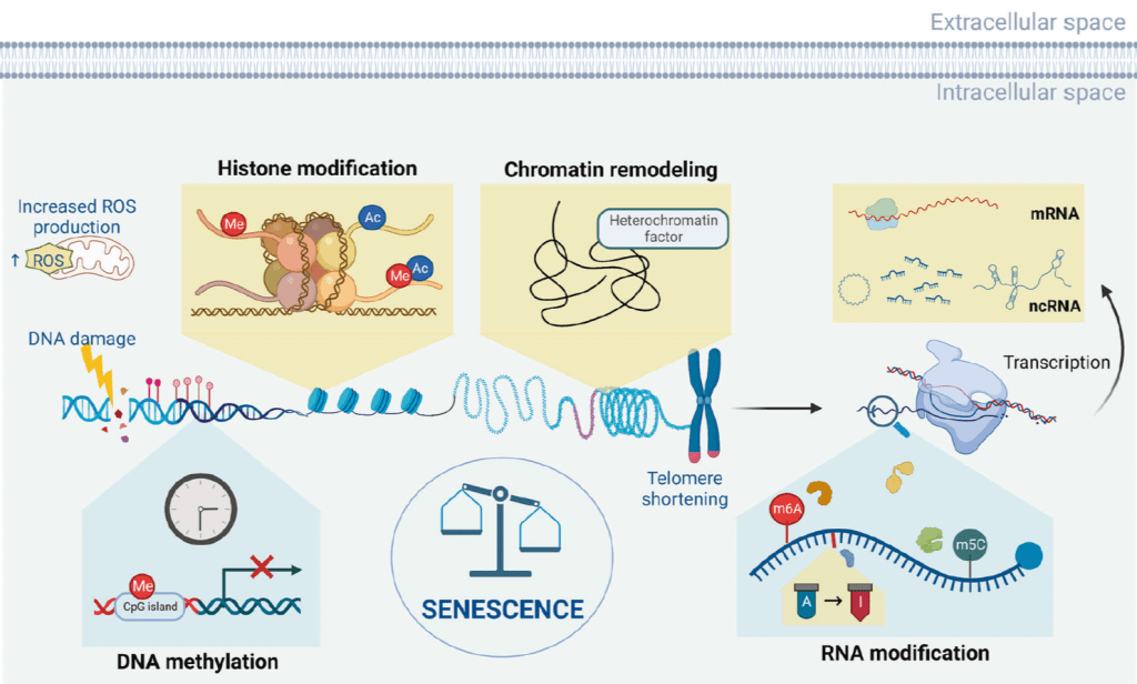 During aging and the emergence of cellular senescence, a series of epigenetic changes occur in cells, including alterations in DNA methylation, chromatin remodeling, histone modification, RNA modification, and ncRNA regulation